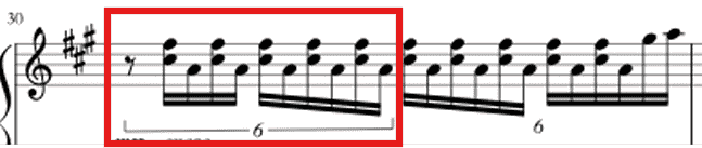 2表示该六连音的总时值相当于一个二分音符,8表示当前音符在乐谱上显示的时值相当于八分音符的时值,6表示这是一个六连音